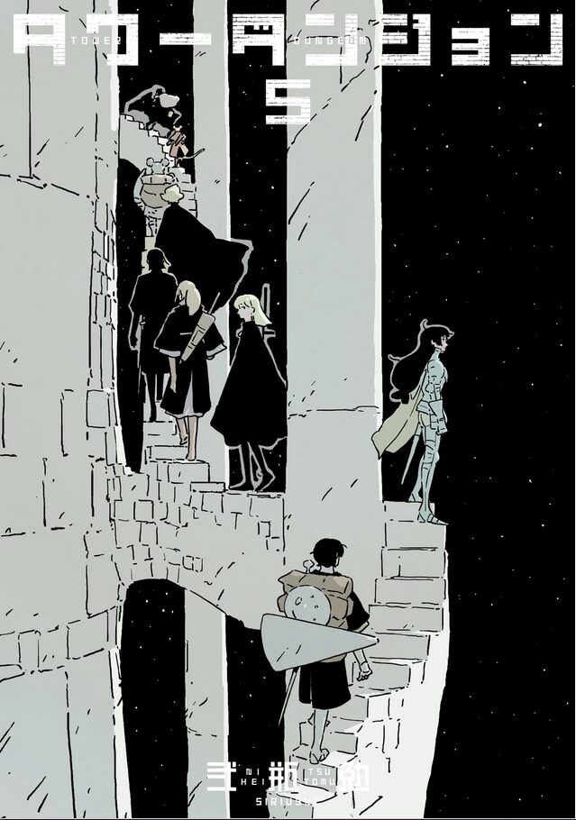 The environments instead feature vaulted stone ceilings, crumbling masonry, and massive columns. Despite this stylistic shift, the series still maintains Nihei’s signature sense of “impossible scale.” The tower itself is so enormous it appears to have fallen from the sky, looming over a seemingly boundless landscape that invites curiosity about what other species or dangers might exist beyond the kingdom. Suspended just above the ground, the dungeon projects an ominous presence, daring only the bravest to ascend its treacherous stairs.